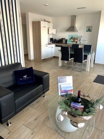 This apartment has 2 bedrooms, one of which has 2 single beds, which are wheelchair accessible. In this bedroom there is another television. The double bed in the other bedroom is a high box spring bed, from which older people can also get up easily in the morning. A modern, well-equipped kitchen in the spacious living and dining area helps you to prepare your holiday recipes. Weather permitting, a large table and 4 seats are available on your terrace.